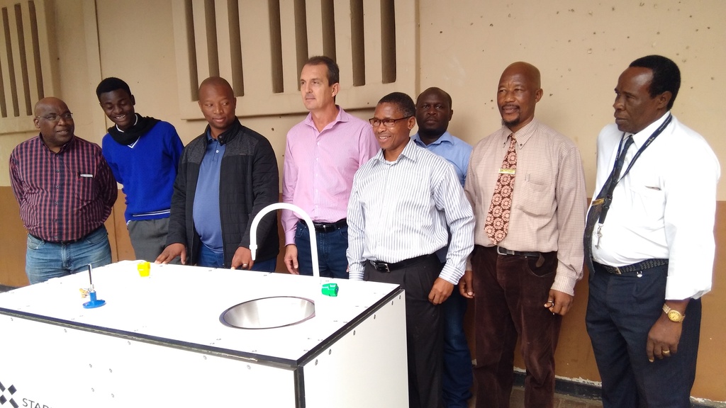 Grade 12 learners from VK Kwinana Senior Secondary School washing hands after conducting an experiment on the Kusile Labs & Technology Mobile Science Lab in Kwa Nobuhle, Uitenhage, Eastern Cape.